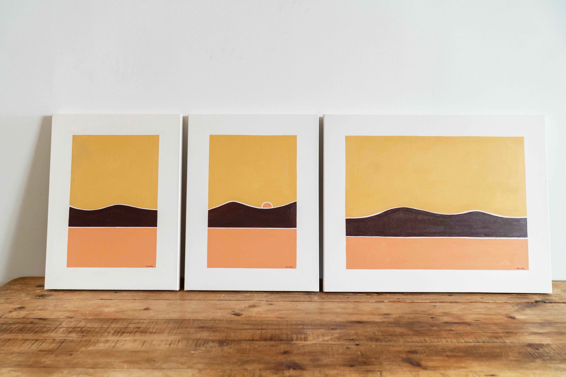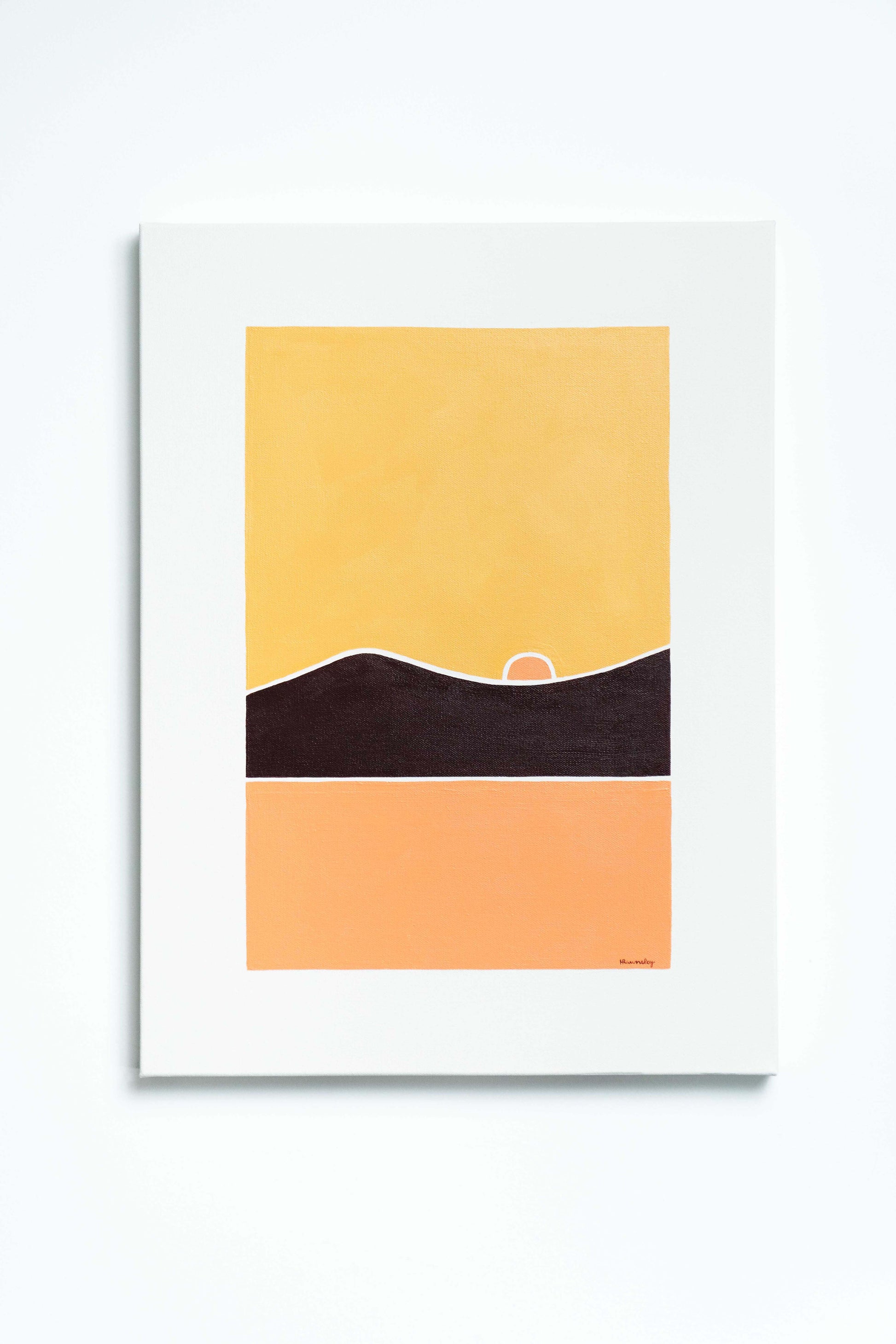 Original landscape. Acrylic painting on a 1 1/2in deep panel with wire on back. A minimalist abstract landscape in mustard, maroon and coral hues. Clean lines and bold colors inspired by the desert. This painting includes shipping within the US.