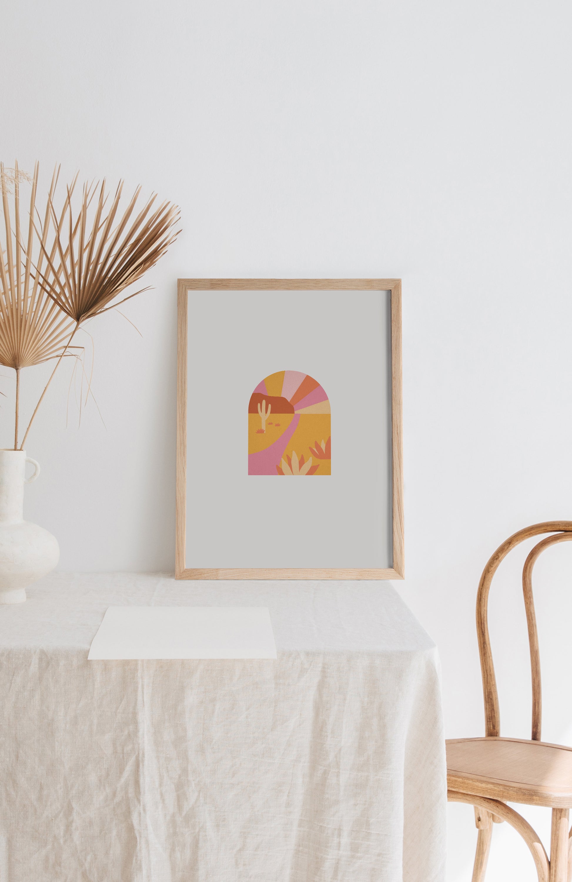 Add a pop of color and personality to your walls with this sunburst desert cactus art print. This bold modern desert illustration is inspired by the colors of the California desert landscape and mid-century modern design. Let this retro desert cactus archway print invite the joyful desert scenery into your home.