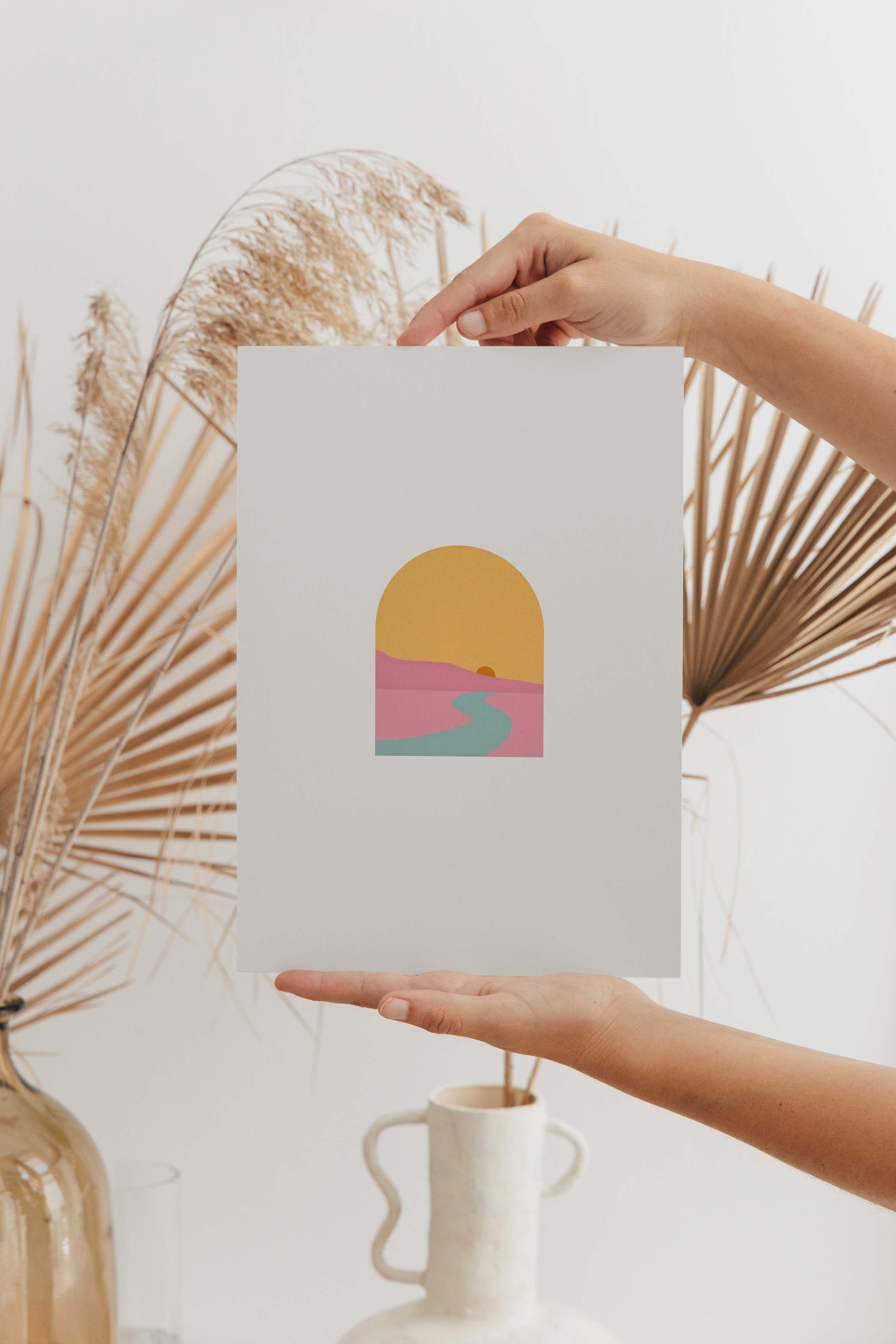 Add a pop of color and personality to your walls with this minimalist desert art print. This bold desert river landscape illustration is inspired by the colors of Palm Springs and mid-century modern design. Let this desert archway art print invite the joyful desert scenery into your home.