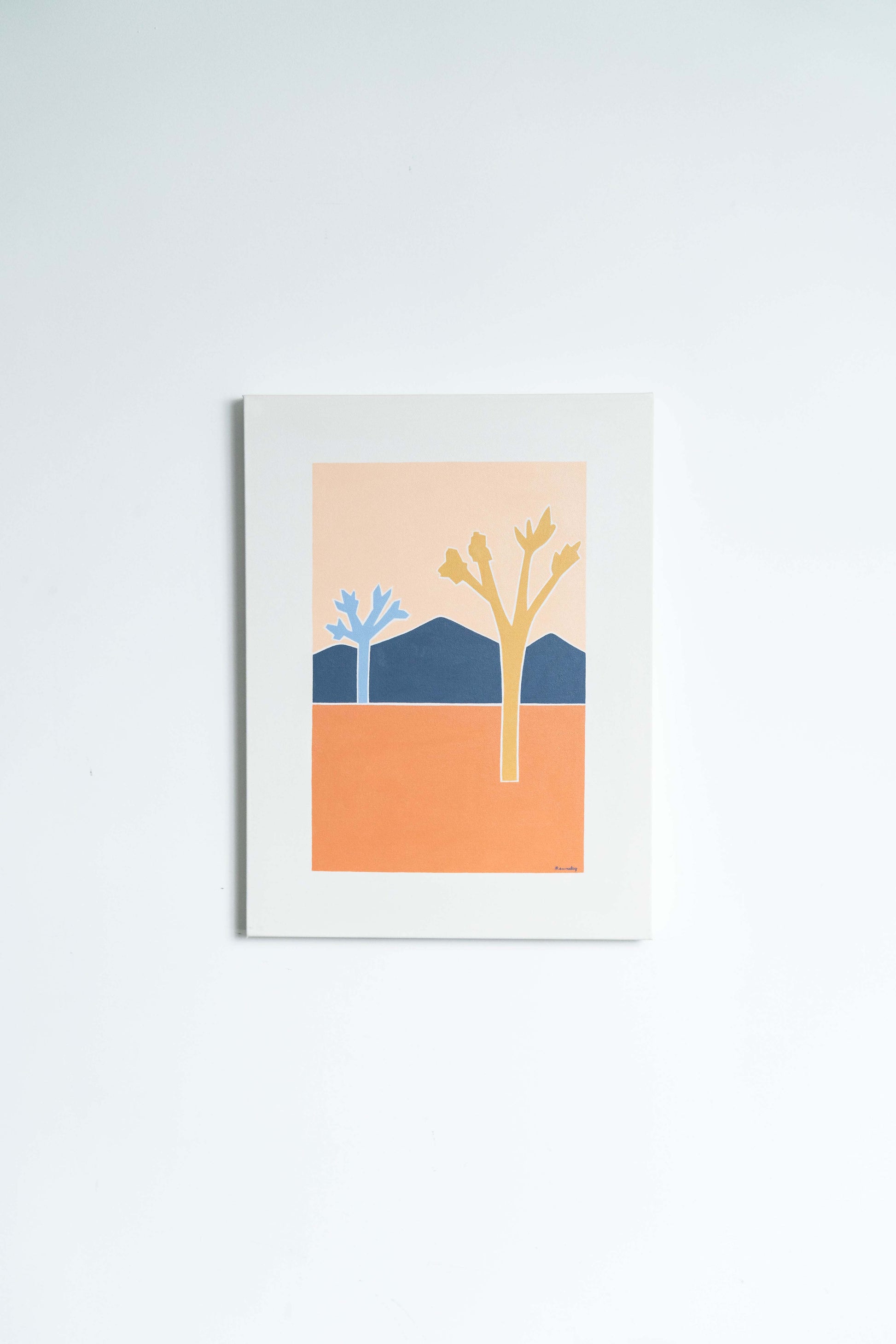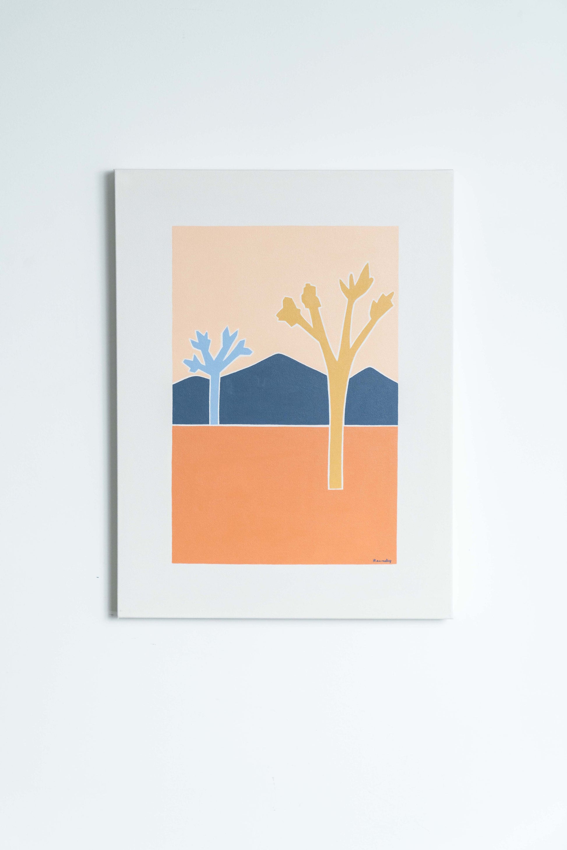 Original landscape. Acrylic painting on a 1 1/2in deep panel with wire on back. A minimalist abstract landscape with Joshua trees in coral, peach, and blue hues. Clean lines and bold colors inspired by the desert. This painting includes shipping within the US.