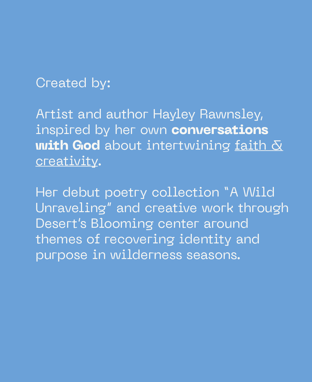 Created by: Artist and author Hayley Rawnsley, inspired by her own conversations with God about intertwining faith and creativity. Her debut poetry collection "A Wild Unraveling" and creative work through Desert's Blooming center around themes of recovering identity and purpose in wilderness seasons.