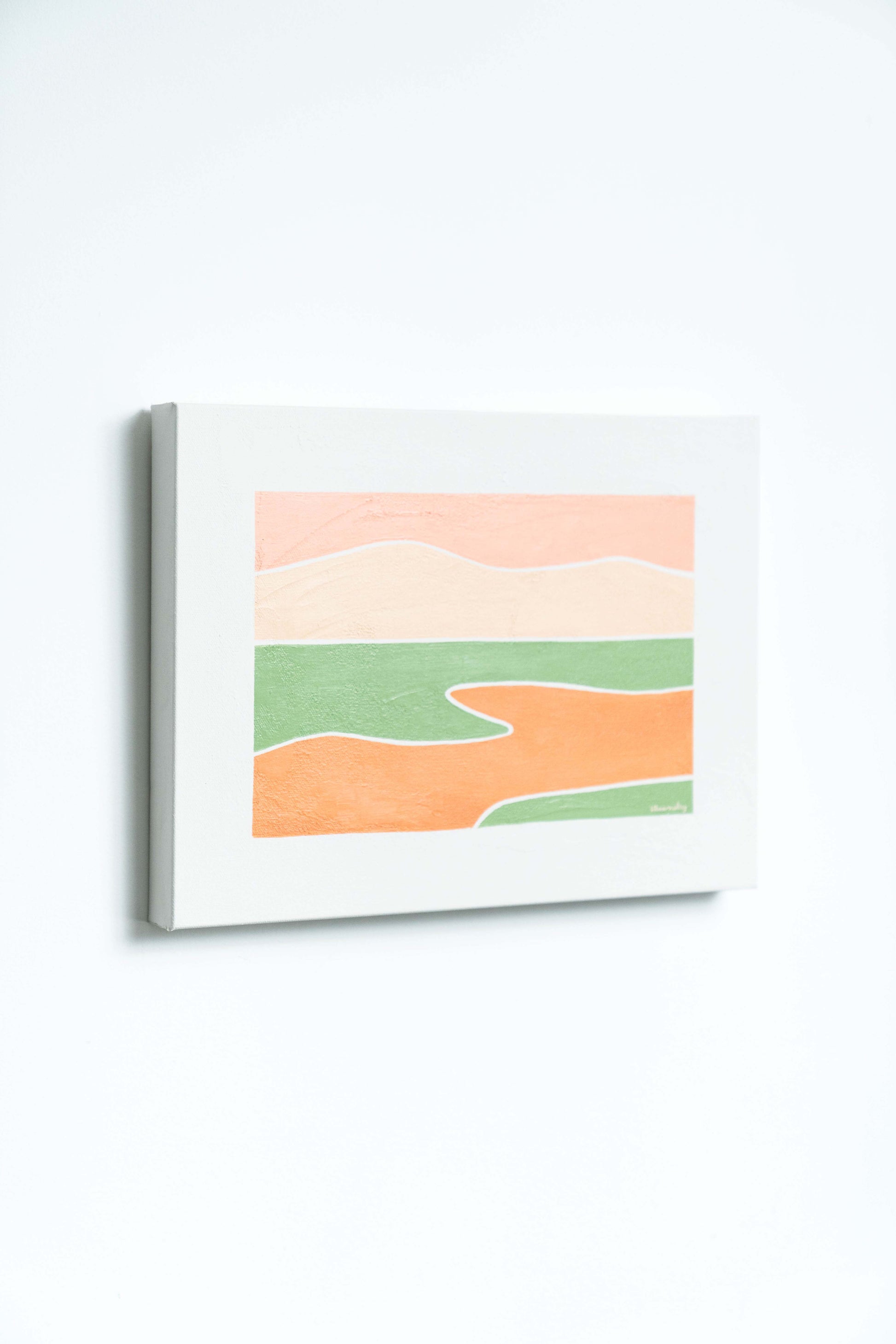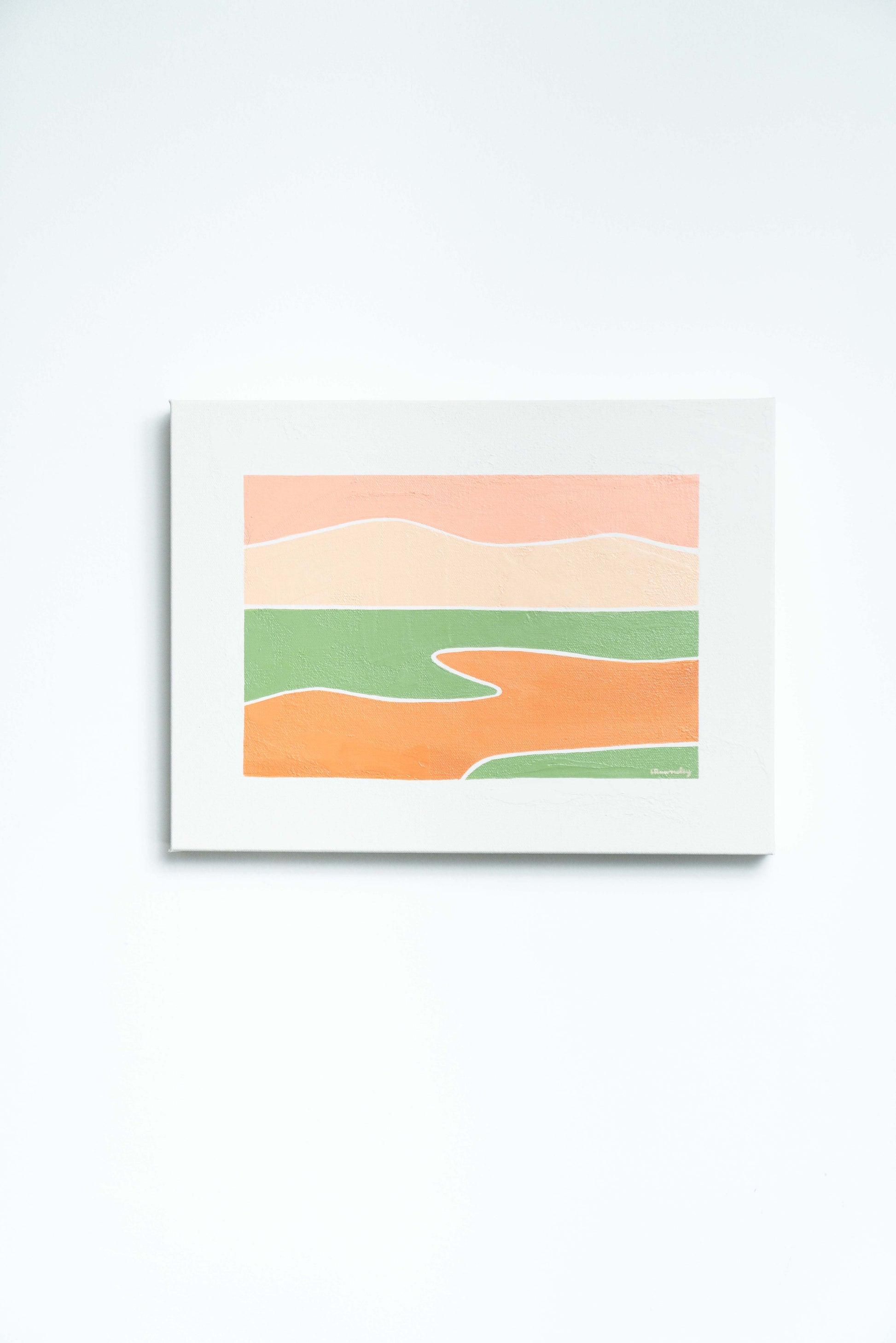 Original landscape. Acrylic painting on a 1 1/2in deep panel with wire on back. A minimalist abstract landscape in coral, peach, and green hues. Clean lines and bold colors inspired by the desert. This painting includes shipping within the US.